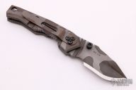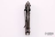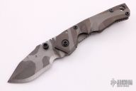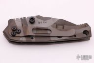 This TripWire by Dwaine Carrillo features a stripe finished blade with dual thumbstuds and notched thumb rest. Tiger striped titanium frame and pocket clip for tip down carry. Strong lock up, nice detent and blade seating is center. Has a couple light otherwise excellent condition.