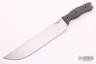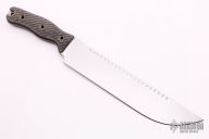 This SawMandu by Swamp Rat features a satin finished blade with sawteeth on the spine, .190" blade stock and 1.938" blade depth, full tang construction. The handle has black canvas micarta scales. New from maker.