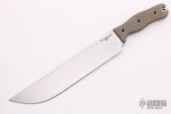 This SawMandu by Swamp Rat features a satin finished blade with sawteeth on the spine, .190" blade stock and 1.938" blade depth, full tang construction. The handle has green canvas micarta scales. New from maker.
