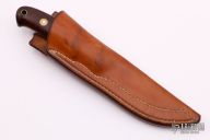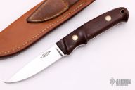 This knife by Bob Loveless and SR Johnson features a mirror finished blade, .186" blade stock and .905" blade depth, full tapered tang construction. The handle has wood scales with brown liners and a lanyard hole. Comes with brown leather sheath. Blade is marked 781. Excellent condition.
