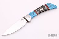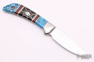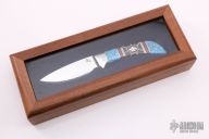 This gorgeous integral drop point hunter has a high polished blade with David Yellowhorse's logo Beautiful piece with an engraved stainless bolster and and intricate turquoise, steel, opal, jasper, and onyx(?) scales/spacers. Full tapered tang construction. Blade is 1/8" thick and 1 1/8" deep. A thunderbird inset is in both sides of the onyx band. Signed by Yellowhorse and stamped 011. Comes with a wood display box. Excellent condition.