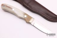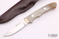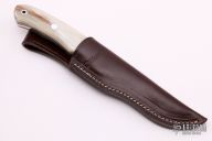 This Hunter features a satin finished blade with .144" blade stock and 1.038" blade depth, full tang construction. The handle has nickel silver bolsters and sheep horn scales. Comes with brown leather sheath and original box. Has a little patina on the bolsters, otherwise excellent condition.