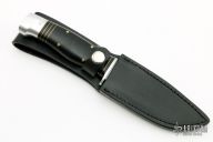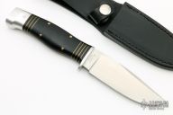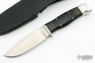 This knife by AG Russell features a satin finished blade with .142" blade stock and 1.236" blade depth, hidden tang construction. The hand has an aluminum guard and butt, black G-10 grip with black/brass spacers. Comes with original box and black leather sheath. Excellent condition.