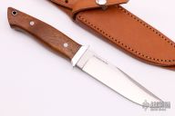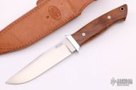 This Sandstorm from Bark River Knives features a clip point satin finish blade marked "First Production Run" on the "B" side. The handle is comprised of an aluminum guard with a mesquite burl wood grip over hidden tang construction. Lanyard hole and lanyard in pommel. Includes original packaging and leather sheath. Has some spots on the guard, otherwise excellent condition.