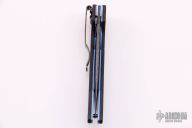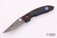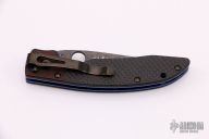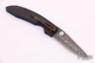 Limited edition linerlock by Benchmade features a Hakkapella Damasteel blade.  Bolsters are desert ironwood and scales are carbon fiber.  Blue anodized titanium liners with titanium barrel spacers. Blued medallion with butterfly logo. Nice detent, lockup and seating. Excellent condition with original box and papers dated Jan 5, 2011. #16of250.