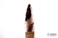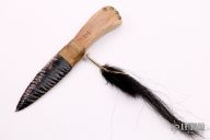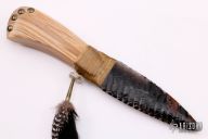 This knife has a blade made from obsidian, .355" blade stock and 1.552" blade depth, hidden tang construction. The handle has a sinew wrapped guard with wooden grip. Comes with a zippered case. The handle is marked 616 of 1847. Excellent condition.