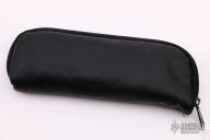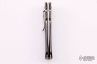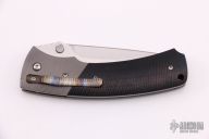This linerlock folder by Larry Davidson features a hand rub satin finished recurve blade with dual thumbstuds and a notched thumb ramp. The handle features bead blasted and textured titanium bolsters, textured black G-10 scales over titanium liners with an anodized titanium tip down pocket clip. Nice detent, lockup and blade seating. Excellent Condition. Comes with a zippered case. #5 on blade