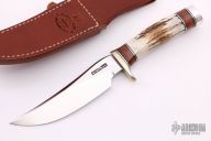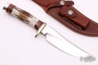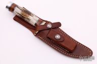 The Model 27 is an ideal all-around heavy-duty sportsman's knife. This knife has a satin finished blade with .190" blade stock and 1.402" blade depth, hidden tang construction. The handle has a nickel silver guard, stag grip with stacked leather, black and duralumin spacers, duralumin butt cap. Comes with a brown leather sheath. Excellent condition.