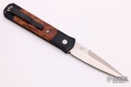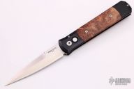 The Godfather 4" blade auto knife represents the influence of original Italian "Stiletto" style auto knife and Pro-Tech's modern coil spring precision. This Godfather has a satin finish blade and maple burl wood inlays in the black aluminum handle with tip up black stainless clip. Includes original box and paperwork. Excellent condition.