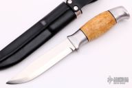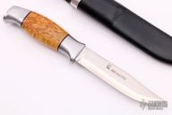 This knife by Brusletto and Co features a polished scandi ground blade, .147" blade stock and .956" blade depth, hidden tang construction. The handle has a nickel silver guard and butt with a burlwood grip. Comes with black leather sheath and original box and papers. Excellent condition.