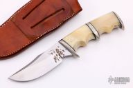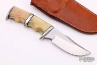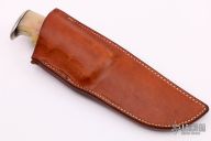 This hunter by RJ Knives features a satin finish blade, nickel silver guard and butt, and sheep horn grip, black spacers. .251" blade thickness and 1.430" blade depth. Hidden tang construction. Comes with brown leather sheath and original box. Great feel in the hand. Has some patina on the handle and rust on the blade, otherwise good user condition.