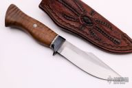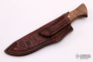 This Retro Woodcraft by Chuck Schuette features a hand rub satin finished clip point blade with false top edge, notched thumbrest and hammer marked flats, .161" blade stock and 1.455" blade depth, hidden tang construction. The handle has a Railroad Spike steel guard that has been blackened, stabilized koa grip with a fileworked nickel silver spacer, single mosaic pin. Comes with a beautiful hand tooled brown leather sheath. New from maker.