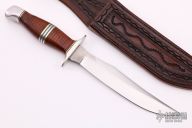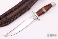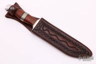 This Retro Fighter by Chuck Schuette features a hand rub satin finished clip point blade with false top edge and hammer marked flats, .163" blade stock and 1.218" blade depth, hidden tang construction. The handle has a nickel silver guard, stacked leather grip with black/brass/blue spacers , aluminum butt. Comes with a beautiful hand tooled brown leather sheath. New from maker.