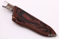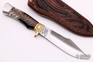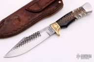 This Retro Fighter by Chuck Schuette features a satin finished clip point blade with false top edge made from a Simonds BlackMaster file, .202" blade stock and 1.501" blade depth, hidden tang construction. The handle has an engraved brass guard, stabilized spruce cone grip with aluminum butt. Comes with a beautiful hand tooled brown leather sheath. New from maker.