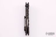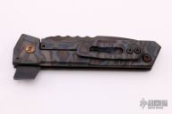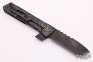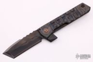 This "Street Fighter" framelock flipper from Crusader Forge features their Phantom blade finish on a tanto chisel ground blade. The handle has a milled titanium frame with flamed finish. Matching titanium clip positioned for tip up carry. Smooth action. Nice lockup, detent, and seating. Very nice work.  Comes with original box and papers. Excellent condition.