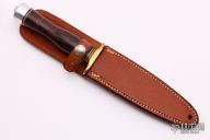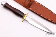 The Model 2-5 by Randall Made Knives is a heavily made dagger or dirk. This knife has a 5" carbon steel satin finished double-edged blade, .159" blade stock and .994" blade depth, hidden tang construction. The handle has a brass hilt and duralumin butt, stacked leather grip with red/white/blue spacers. Comes with a brown leather rough back sheath. Has a couple light scratches, otherwise excellent condition.