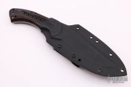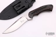 This "Crusader" fixed blade by Todd Begg features a hand rub satin finished clip point recurve blade with false top edge, notched thumbrest and finger rest, .238" blade stock and 1.371" blade depth, full tang construction. The handle has carbon fiber scales with brown canvas micarta inlays, has lanyard hole. Comes with black kydex sheath with TekLok. Excellent condition.