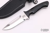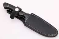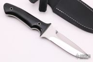 This Chute knife by Walter Brend features a double edged blade with mirror polished grinds and satin flats, .199" blade stock and 1.142" blade depth, full tang construction. The handle has black canvas micarta scales with hollow pins. Comes with a black leather sheath. New condition.
