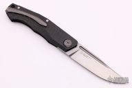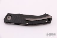 This Pero Flipper by Shirogorov and Dmitry Sinkevich features a matte finished clip point blade with fullers, notched thumbrest and flipper. The handle has a carbon fiber frame, inlaid titanium liner with stainless lockface insert and ceramic detent, matte finished titanium backspacer and tip up clip with hidden screws. Has MRBS. Comes with original box and papers. Excellent condition. #113of 200