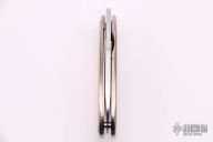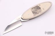 This Oval folder is a Christian Wimpff design by Klotzli. The knife has a satin finished wharncliffe blade. The handle has a titanium frame with fossil mammoth ivory inlays on both sides. One side has scrimshaw by Attila dated 2006 and 1 of 25. Excellent condition.