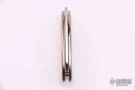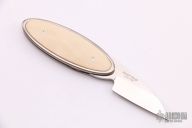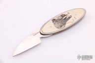 This Oval folder is a Christian Wimpff design by Klotzli. The knife has a satin finished wharncliffe blade. The handle has a titanium frame with fossil mammoth ivory inlays on both sides. One side has scrimshaw by Attila dated 2006 and 1 of 25. Excellent condition.