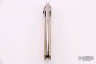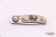 This Paul Pocket Knife features the Paul Poehlmann axial locking mechanism. Opens by depressing the button on the backside and rotating the face side dial. Closes the same way, rotating the dial in the opposite direction. It features a drop point mirror polished blade. The handle is comprised of mammoth ivory scales with scrimshaw over stainless steel liners. Excellent condition.