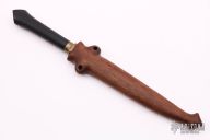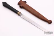 This Assassin's Knife by Fred Ott features a hand rub satin finished blade with nice hamon, .167" blade stock and .728" blade depth, hidden tang construction. The handle has a bronze guard with a blackwood grip. Comes with a nicely made wooden scabbard. Has a very light stain on the tip of the blade, otherwise excellent condition.
