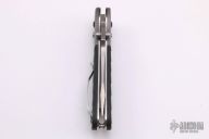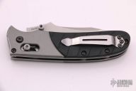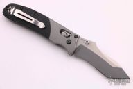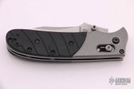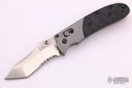 This knife by Heckler & Koch is made by Benchmade and designed by Mike Snody, it features a tanto recurve partially serrated blade with notched thumbrest and dual thumbstuds. Bead blasted aluminum bolsters with a rubberized handle for sure grip. Tip up clip, left or right reversible. Nice lockup, action and blade seating. Has some scuffs/scratches, may have been resharpened, otherwise good user condition. Comes with original box.
