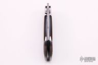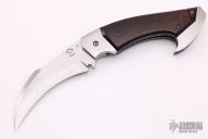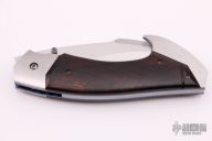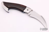 This Left Handed Rastor by Reese Weiland features a hand rub satin finished hawkbill style blade with single checkered thumbstud. Satin finished titanium double bolsters, anodized and jeweled titanium liners, ironwood burl scales, stainless steel back spacer. Nice detent, lockup and blade seating. Numbered 003 inside backspacer. Comes with a zippered case, Excellent condition.
