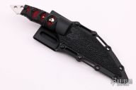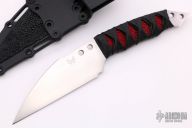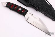 This 10530 JuJu wukk by Benchmade is a Snody Design, it features a handle covered in red ray skin and wrapped with black cord; it has a skull and bone menuke. Has a satin finished chisel ground wharncliffe blade with notched thumbrest, .214" blade stock and 1.560" blade depth, hidden/full tang construction. Comes with original molded sheath. Has some light sheath scratches, otherwise excellent condition.