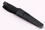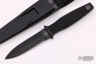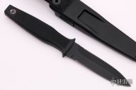 This Knife features a black double-edged blade and a hidden tang construction.  .383" Blade Stock.  .803" Blade Depth.  The handled is composed a black synthetic non-slip material. The sturdy black zytel sheath allows you to fasten the knife on your belt or your pack - even upside down. Excellent Condition.
