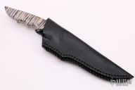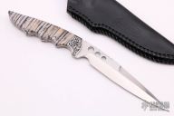 Visit this maker's website: Moulton Knives. "I started making Custom Knives as a Full-Time maker/designer in 1991. I currently use CPM-154CM, a VERY new Version of the standard 154CM steel. It is a very clean powdered version of the standard 154CM,still in its primary developmental stage. I am one of very few knifemakers that have access to this steel, until it is through the development & analysis process. I also occasionally use the standard ATS-34. I also use Damascus steel forged by some of my friends, in my creations.All of my knives are made freehand. That is, I do not incorporate the use of mills, lathes, surface grinders, etc....in my shop, there are just a couple of basic belt grinders, disc grinders, a drill press and a band saw. (I feel that as long as I can make a modest living building knives with a minimum of mechanical assistance, relying instead on my own hand craftsmanship then that is the way I prefer it). And I hope that this manner of making knives will in the long run give my knives a better value when I am long gone. I strive, above all, to build a high quality product that the discriminating buyer will be proud to own. All knives are created by stock removal and are hollow ground, most all of them having tapered tangs and dovetailed bolsters. Then, with each piece I create, I offer a personal satisfaction guarantee because I stand behind my work and it's underlying quality is paramount.I strive to create designs that are unique in the custom knife market. I want people to know when they see one of my knives in a collection, "that's a Moulton"! For me, this is the ultimate satisfaction I get from this work."