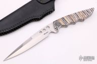 This Fighter by Dusty Moulton features a hand rub satin finished blade with false top edge and fileworked thumbrest on spine, .154" blade stock and 1.165" blade depth, full tapered tang construction. The handle has engraved and dovetailed stainless steel bolsters, mammoth tooth scales with black liners mosaic pins and a lanyard hole. Comes with black leather sheath and zippered case. Engraving was done by the maker. Excellent condition.