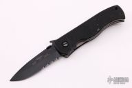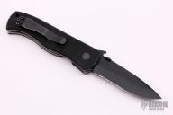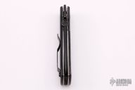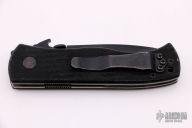 This CQC-7A by Emerson Knives features a black drop point blade with notched thumbrest and thumbdisc. The handle has black G-10 scales, titanium liners, tip up black stainless steel pocket clip.  S/N 0565.  Scuffs are visible on the handle otherwise the knife is in excellent condition.