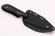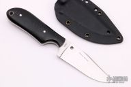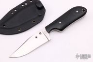 This Perrin inspired Street Beat by Spyderco has a satin finished VG-10 clip point blade with full tang and notched thumbrest. Blade stock is .154", depth is 1.087". Handle is black linen micarta with polished stainless steel pins and lanyard tube. Comes with Kydex sheath.  Excellent condition.
