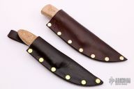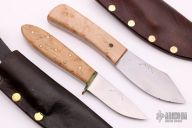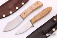 This pair of knives by Idaho Knife Works features satin finished blades with approximately .150" blade stock, full tang construction. The handles have maple scales with brass pins. Both come with brown leather sheaths. Both have scratches, otherwise good condition.
