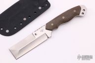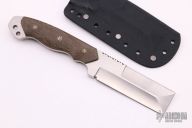 This Razel by Graham Knives features a satin finished blade with fileworked thumbrest, .248" blade thickness and 1.359" blade depth, full tang construction. The handle has contoured canvas micarta scales with mosaic pins and a lanyard hole. The Razel features a sharpened front edge and is a tremendously useful and versatile EDC knife. Comes with a kydex sheath. Light scratches are visible on the blade and handle otherwise the knife is in excellent condition.
