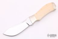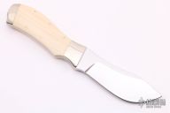 This knife by Leon J Thompson features a mirror polished blade with fileworked spine, .181" blade stock and 1.255" blade depth, full tapered tang construction. The handle has nickel silver bolsters, front and rear, mammoth ivory scales with nickel silver pins. Comes with original order form dated 12/10/1984. and a letter from the maker dated 9/30/84. Excellent condition.