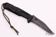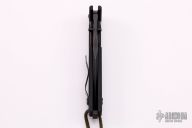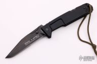 "M.P.C. (Multi Purpose Compact). One of the more robust folding knives on the market, it incorporates all the characteristics of the Fulcrum II, but its heavier blade allows for more efficacious cutting blows, useful in field work.The blade is in the "drop" version and has an upper hilt that works well with the profile of the blade. The handle, of generous size, allows for use with the blade closed, for applying pressure or non-lethal blows. It has a manual security lock which works on the lever mechanism "back lock" thus preventing the blade block being pressed open accidentally during energetic use. This lock can also be used when the knife is closed to prevent the knife being opened if taken without authorization. In this case the knife cannot be opened even if the mechanism is often irrevocably damaged. The tang, in tempered steel, is efficacious for breaking glass and is provided with a hole for fixing on a security lace." Includes original box and tools. Excellent condition.