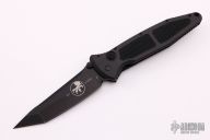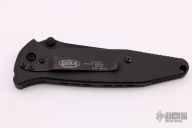This Socom D/A tactical side-opening automatic by Microtech has a black coated tanto plain edge blade. Dated 5/2000; S/N 007. Has a black aluminum handle with rubber inserts, all hardware including clip is matte black. Strong action and perfect lockup.  Has one little wear mark on the edge of the frame, otherwise excellent condition.