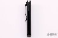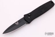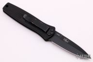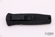 This 3550 Mel Pardue designed side opening auto from Benchmade has a black spear point blade with a false top edge. Handle is matte black finished aluminum with milled contours, spine-thumb safety button, black stainless steel tip down clip, and lanyard hole. Scuffs and dings on handle but otherwise good condition.
