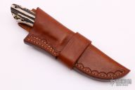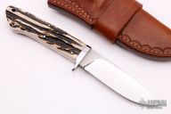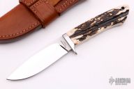This drop point hunter by Schulyer Lovestrand features a drop point blade with satin finish flats, mirror polish grinds, and notched thumbrest, 1/8" blade stock, 1 1/8" blade depth. Full tapered tang construction with stainless guard, red fiber liners, and stag handle. Beautiful fit and finish. Excellent condition. Comes with a brown leather sheath.