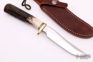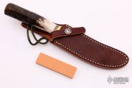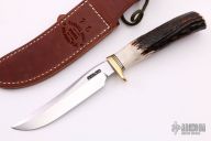 This Model 7-5 by Randall Made Knives features a satin finished upswept blade with false top edge, .156" stock and .960" blade depth, hidden tang construction. The handle has a brass guard with brass/black spacers and a stag handle. Comes with brown leather sheath and original paper wrapping. Excellent condition.