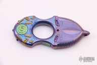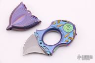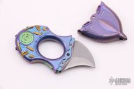 This knuckle knife by Rike Knives features a tumbled double-edged blade. The handle is multi-color anodized and milled titanium with matching sheath. Squeeze the two tabs on the sides to release the sheath. Comes with zippered case and takedown tool. Excellent condition.