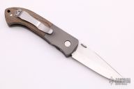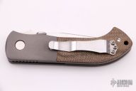 This Custom Emerson MV-5 Viper from Emerson Knives features a satin finished clip point blade with swedge, knurled thumb disc and notched thumb ramp. The handle is comprised of bead blasted and dovetailed titanium bolsters and green canvas micarta scales over titanium liners and black G10 backspacer. The steel pocket clip is positioned for tip up carry. Has a thick locking titanium liner. Lanyard hole in pommel. Excellent condition. Comes with a zippered case.