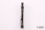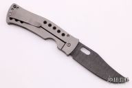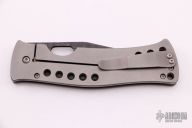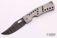 This Moran Bowie framelock folder by Tom Mayo features a clip point Damascus blade with thumbhole and false top edge. The handle has a bead blast titanium frame and tip up clip. Smooth action. Nice blade seating, detent and lockup. Excellent work. Comes with a zippered case. Excellent condition.