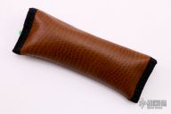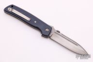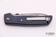 This ATCF by Bob Terzuola features a bead blasted spear point blade with notched thumbrest and a thumbdisc, has fullers. The handle has slate grey G-10 scales, orange peel finished titanium liners, matching G-10 backspacer, tip up orange peel finished titanium clip, lanyard hole at the butt. Comes with a leather velcro case. Nice detent, lockup and blade seating. Excellent condition.