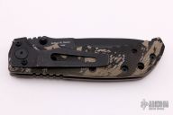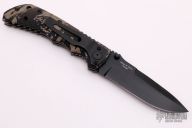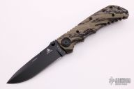 This T3 Ranger Harsey Tactical Folder from Lone Wolf Knives has a black coated drop point blade with false top edge, dual thumb studs and notched thumb ramp. The handle is comprised of textured camouflage polymer over titanium liners and barrel spacers. Black coated stainless steel tip down clip and lanyard hold in pommel. Comes with a nylon belt sheath. Excellent condition.