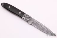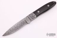 This Hunter from Ed VanHoy features a Damascus drop point blade with a fileworked spine, .149" blade stock and .944" blade depth, full tapered tang construction. The handle has dovetailed and engraved stainless steel bolsters done by his wife Tanya VanHoy, ebony wood  scales with engraved stainless pins, scalloping at the butt around the lanyard hole. Excellent condition.