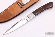 This slim boot knife from Howard Hitchmough features a mirror finished blade with false top edge, London England" mark, .185" blade stock and .834" blade depth, full tang construction. The handle features engraved stainless steel bolsters, cocobolo scales with red liners. Comes with a brown leather boot sheath with clip. Knife is in Excellent condition, has a few very light scratches. Edge of bolster is engraved "SML B4"